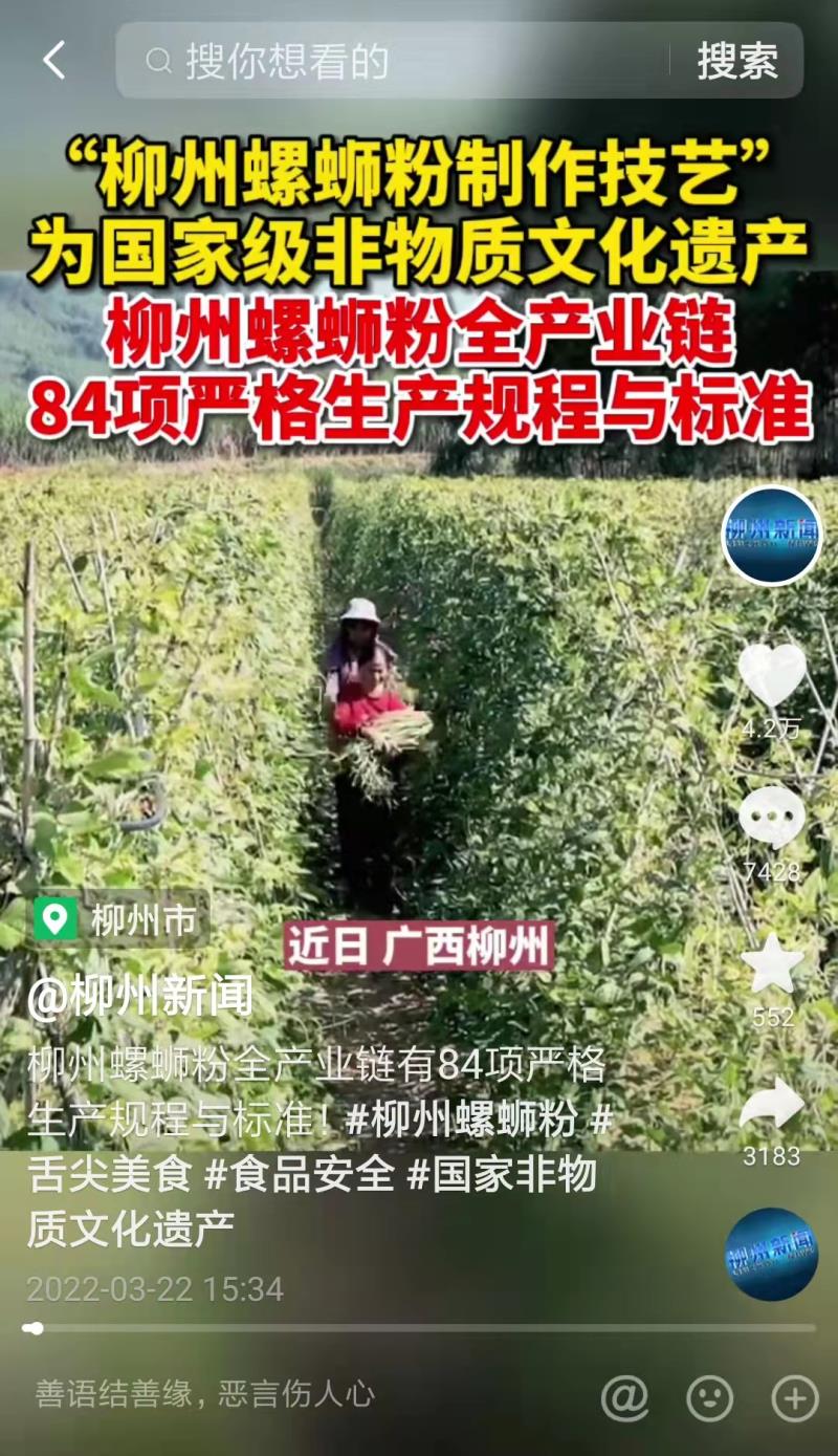(2022年3月22日《柳州新闻》抖音号发布短视频《柳州螺蛳粉全产业链有84项严格生产规程与标准》)